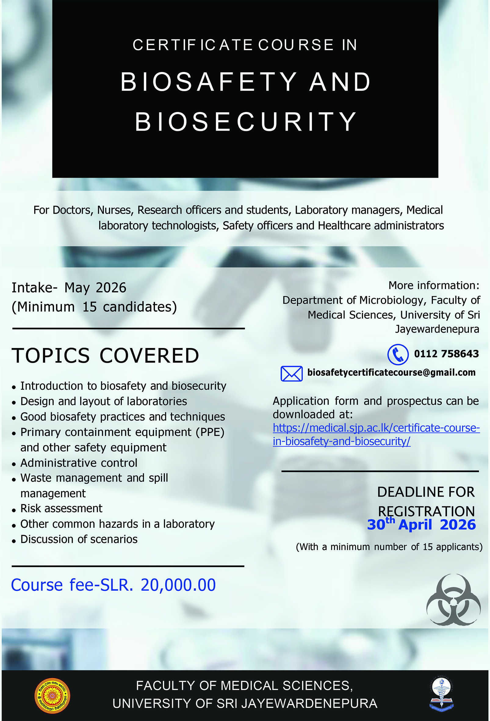 Faculty of Medical Sciences, University of Sri Jayewardenepura is conducting a Certificate Course on Biosafety and Biosecurity to educate the laboratory staff and develop the skills to carry out correct practices and attitudes in the clinical and research laboratories thereby ensuring safe working environment preventing laboratory accidents and laboratory-acquired infections. Further, this will help fulfill the long-felt need of training in biosafety and biosecurity which is highly essential in the country.