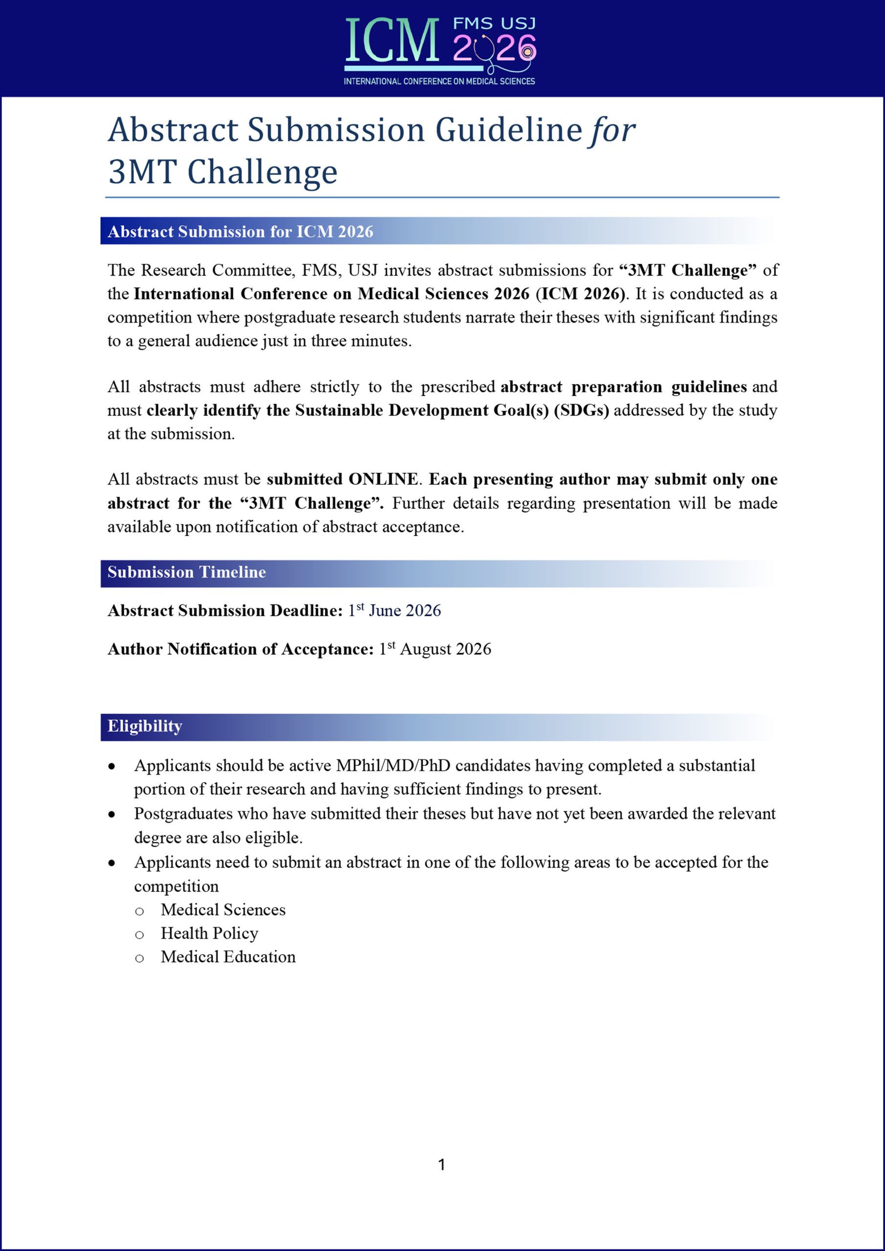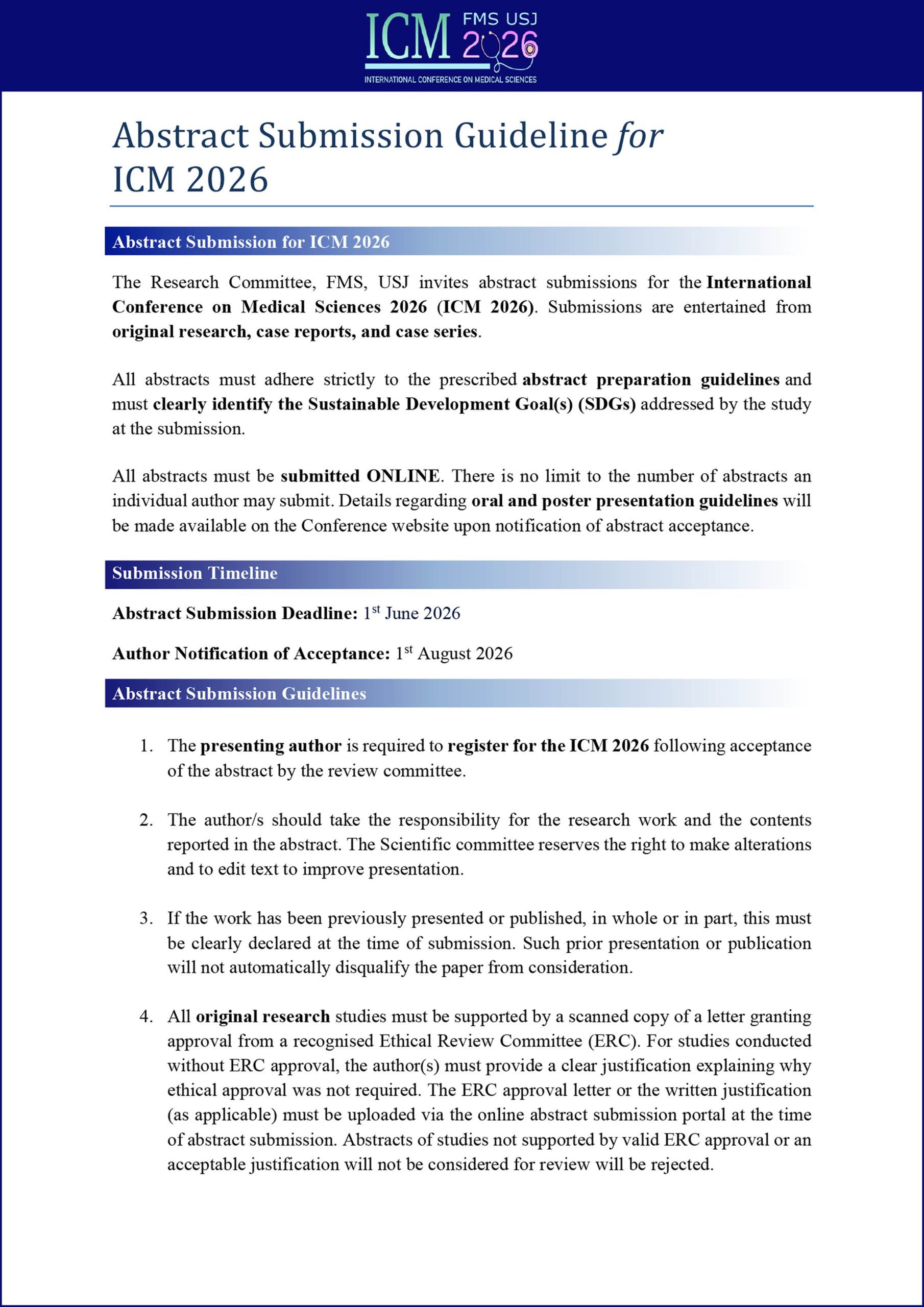 All abstracts must adhere strictly to the prescribed abstract preparation guidelines and must clearly identify the Sustainable Development Goal(s) (SDGs) addressed by the study at the submission. Selected abstracts will be presented as oral or poster presentations.