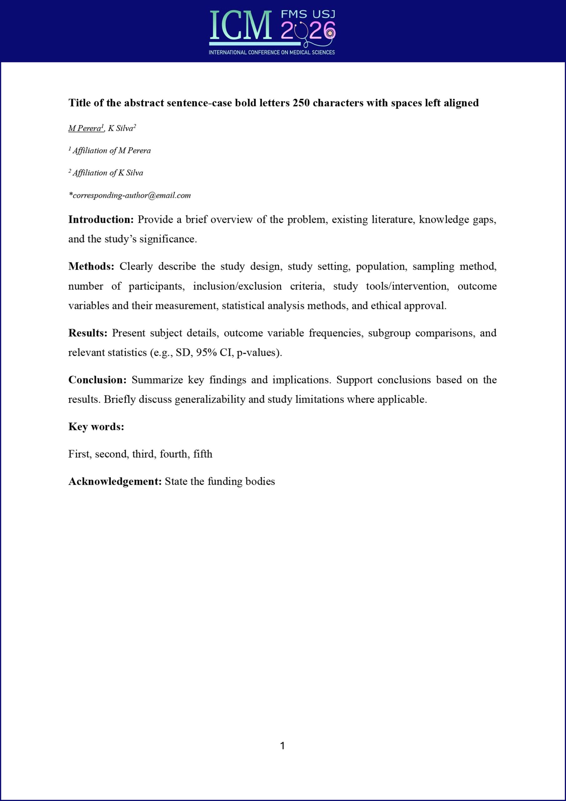 A confirmation email acknowledging receipt of your abstract submission will be automatically emailed to you once you have completed the online abstract submission. If you do not receive this confirmation email, or wish to make changes to your submitted abstract*, please contact the conference secretary by emailing to icm.fms@sjp.ac.lk.
