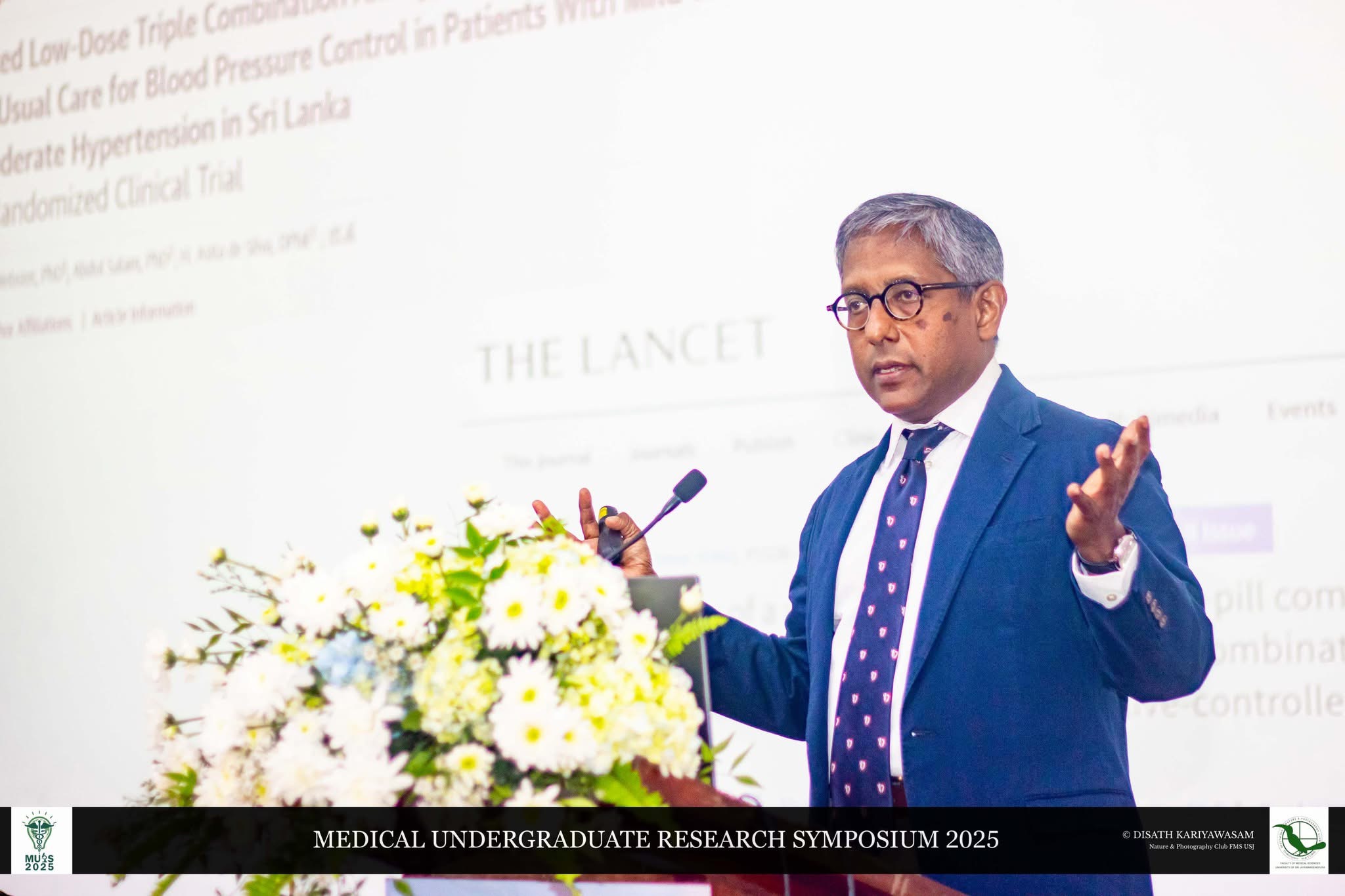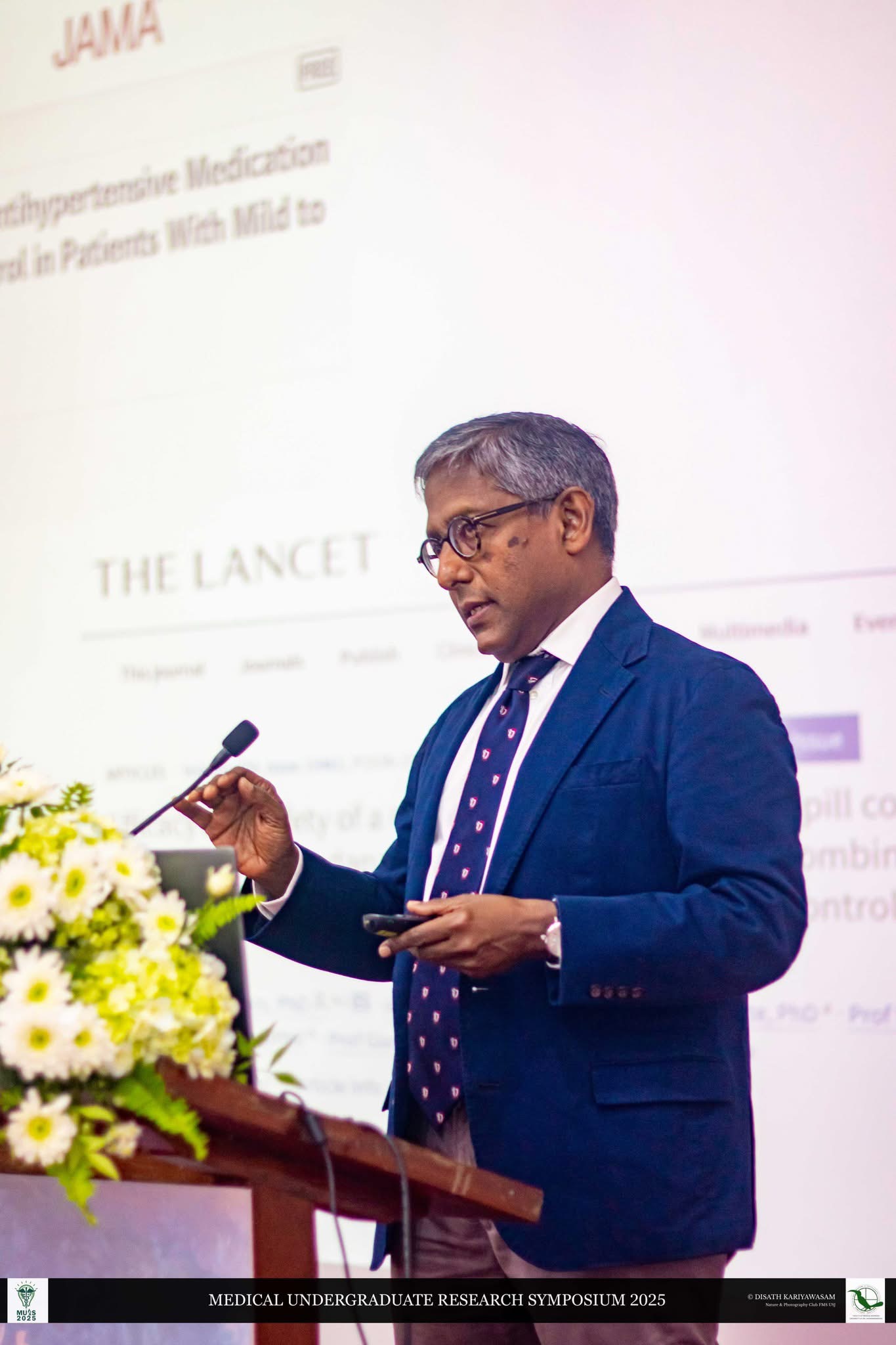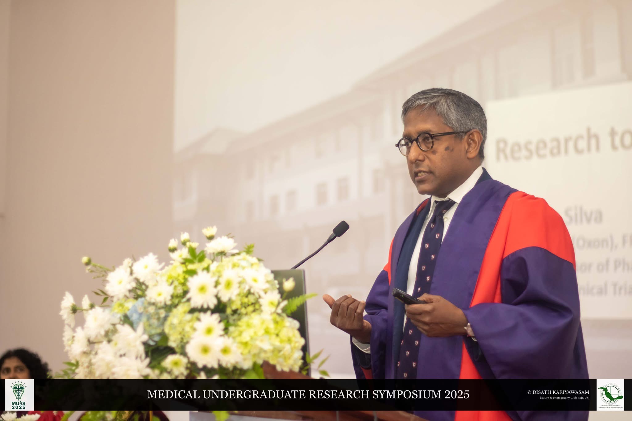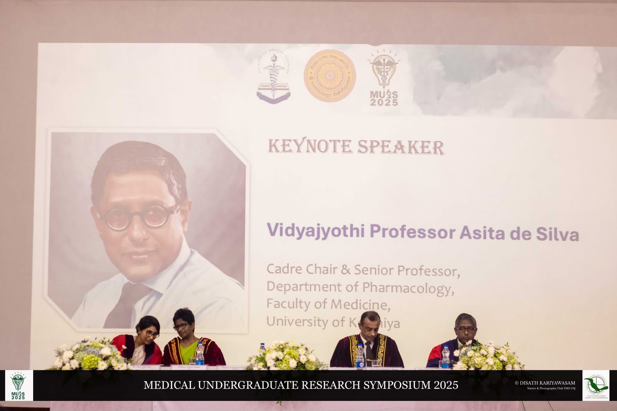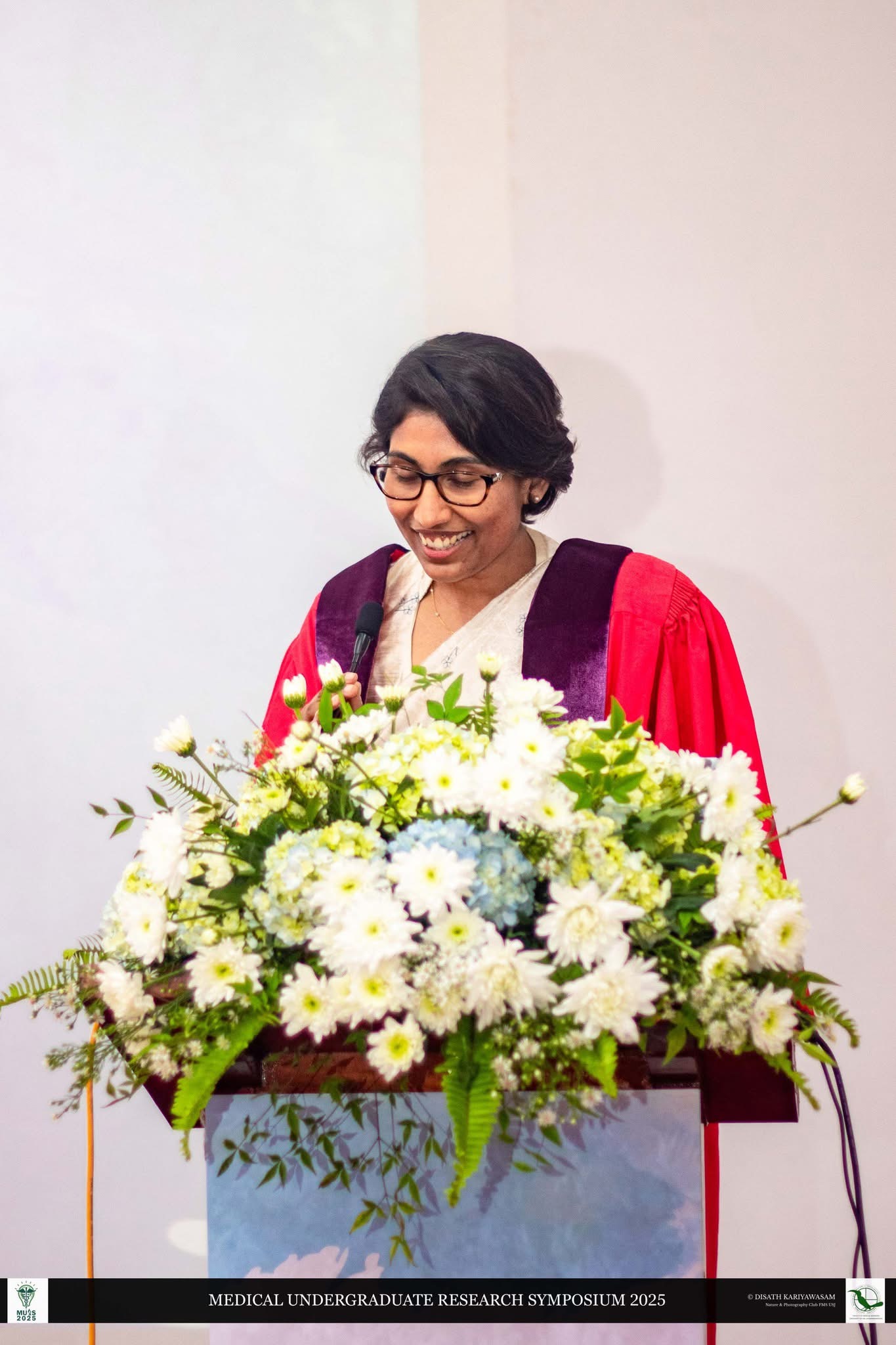 The Inauguration Ceremony of MURS 2025 was graced by Senior Professor Pathmalal M. Manage, Vice Chancellor of the University of Sri Jayewardenepura, and Professor Manori Gamage, Dean of the Faculty of Medical Sciences, whose presence and words of encouragement set the tone for the day. The keynote address was delivered by Vidyajyothi Professor Asita de Silva, Cadre Chair and Senior Professor of Pharmacology at the University of Kelaniya. In a thought-provoking talk, Professor de Silva explored the vital intersection of medical research, innovation, and global health priorities, urging students to align their work with the Sustainable Development Goals (SDGs). Drawing from his extensive experience in clinical pharmacology and global health policy, he underscored the importance of ethical, locally relevant, and evidence-based research that responds to real-world healthcare needs. He called on undergraduates to pursue curiosity-driven inquiry, embrace interdisciplinary collaboration, and contribute to sustainable and transformative healthcare innovations. His address served as a timely and inspiring reminder that early-career researchers have a critical role to play in shaping equitable, resilient, and future-ready health systems.